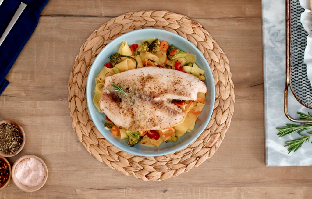 Air-fried tilapia with garlic herb butter tops a bowl of pasta tossed with spiralized carrots, zucchini, and cherry tomatoes. Finished with Parmesan, it’s both cozy and clean.